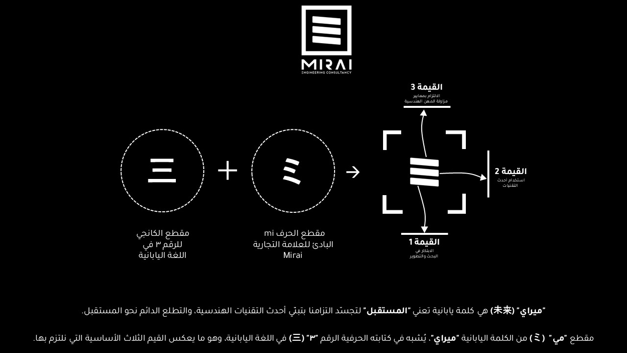 اللافت أن مقطع “مي” (ミ) من الكلمة اليابانية “ميراي”، يُشبه في كتابته الحرفية الرقم “٣” (三) في اللغة اليابانية، وهو ما يعكس القيم الثلاث الأساسية التي تلتزم بها شركة ميراي للاستشارات الهندسية.
